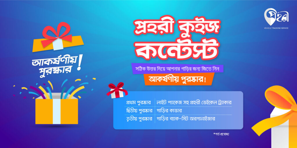 আপনার এতসব টেনশন দূর করতে প্রহরী দিচ্ছে দারুন এক সুযোগ! প্রহরী কুইজ কন্টেস্টে অংশগ্রহণ করে জিতে নিন একটি প্রহরী ভেইকেল ট্র্যাকার (লাইট প্যকেজ সহ)!*